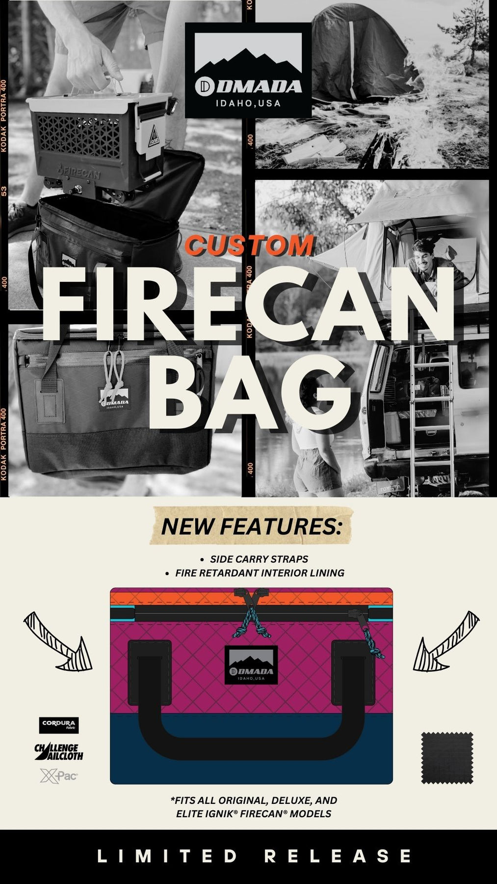 Our newly redesigned Firecan Bag is here — now featuring dual side-carry handles and a fully lined interior with 1.9 oz polyurethane fire-retardant coated ripstop for enhanced protection and durability.